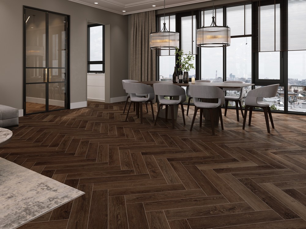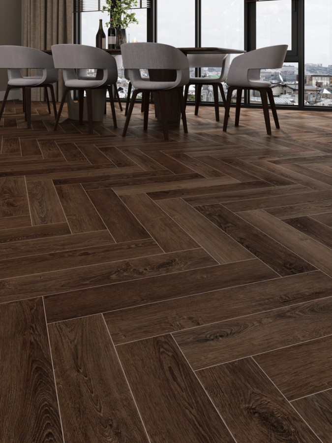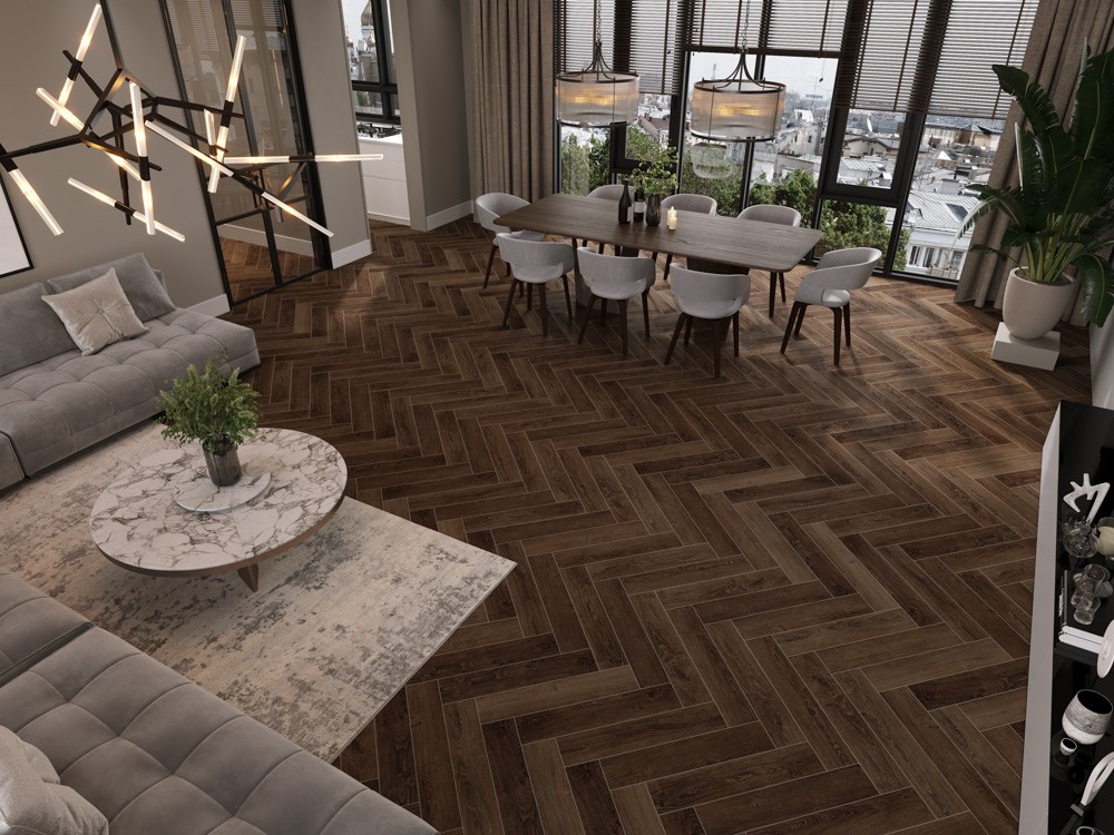 Особенностью данного ламината является 4-х сторонняя фаска, которая придает полу элегантный и завершенный вид. Дизайн в стиле Ёлочка добавляет интерес и оригинальность интерьеру.